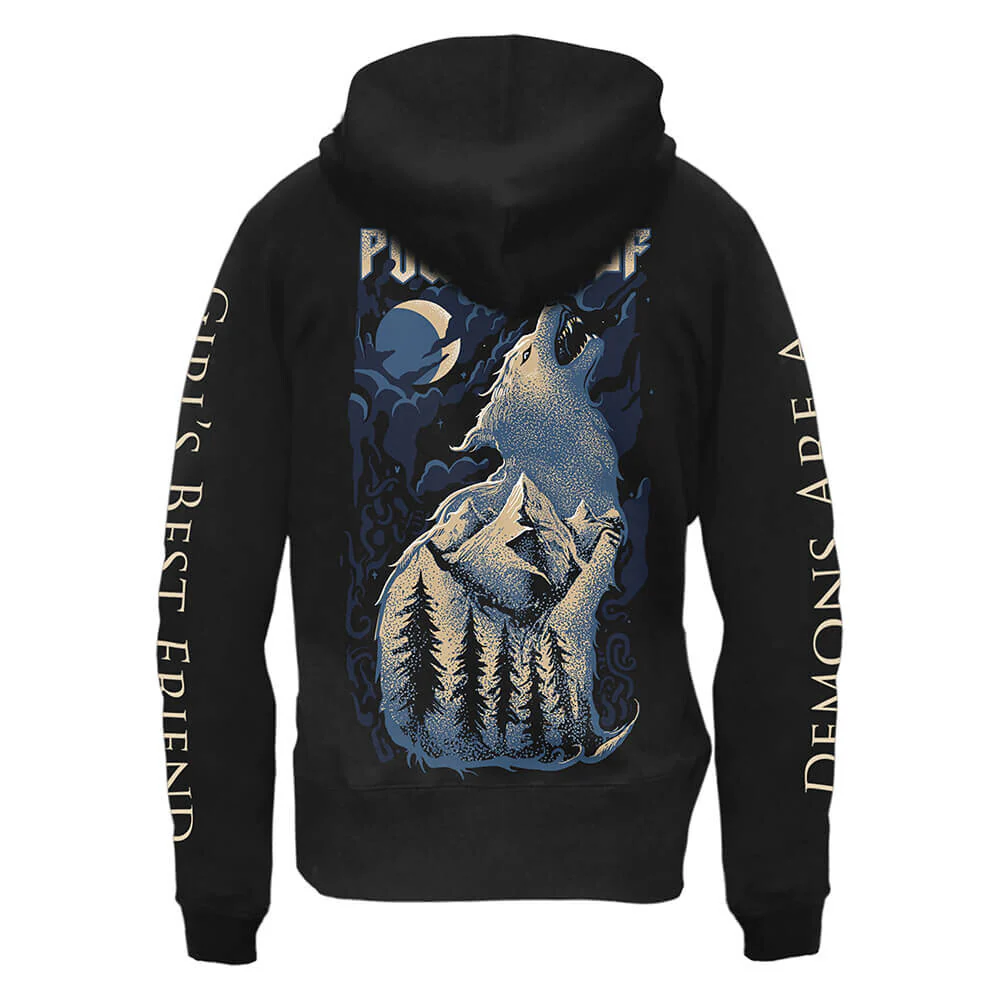 schwarze Girlie Kapuzenjacke mit Print auf der Vorderseite, Prints auf den Ärmeln und großem Backprint. Normale Passform