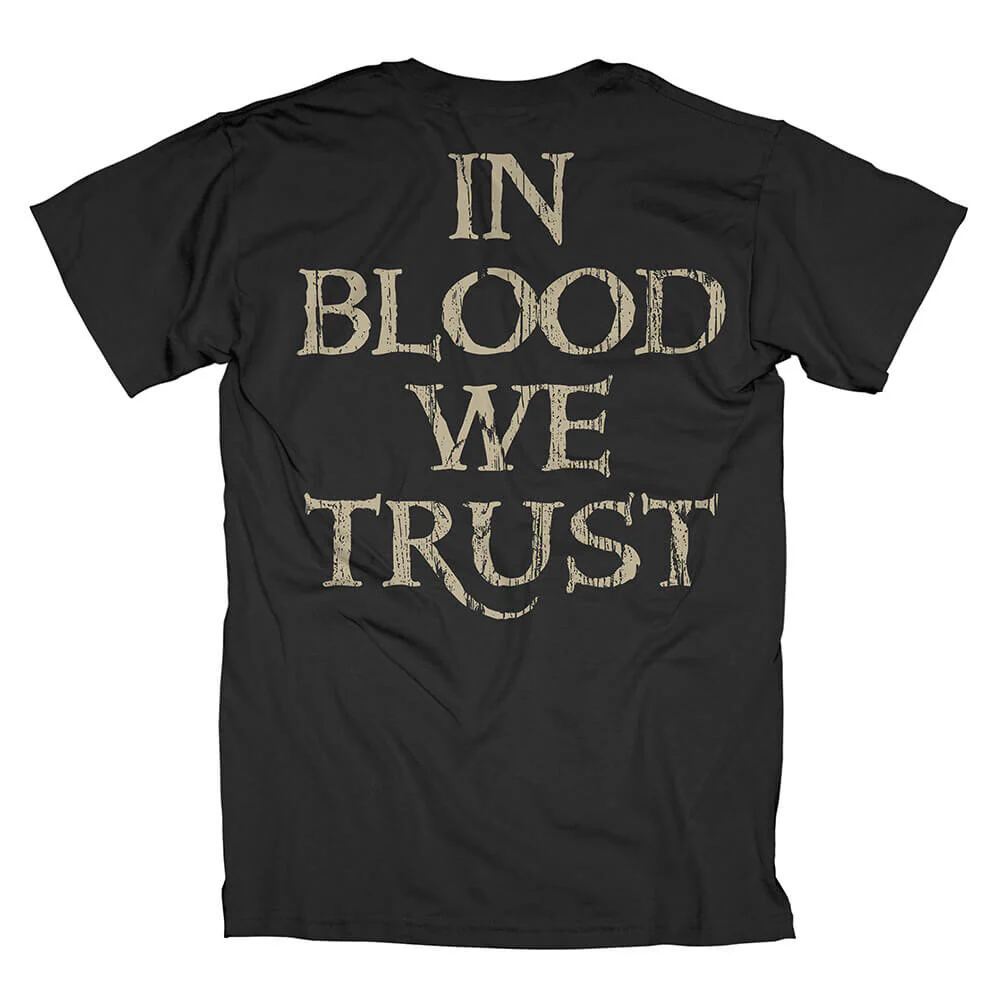 Schwarzes Powerwolf Shirt mit großem Print auf der Vorderseite und "In Blood We Trust" Druck auf der Rückseite. Normale Passform