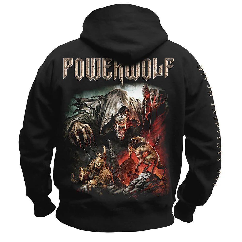 Powerwolf Kapuzenjacke mit großem "The Sacrament of Sin" Design auf der Rückseite, Print auf dem Ärmel und großem Powerwolf Logo auf der Vorderseite. Normale Passform
